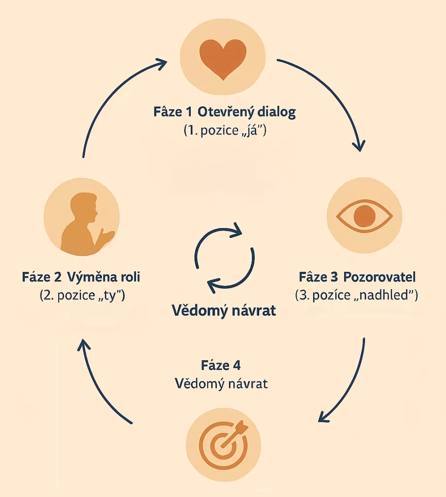 - Pozice vnímání (NLP): řízené přechody „já–ty–pozorovatel–meta“ dávají rozhovoru jasnou mapu.
